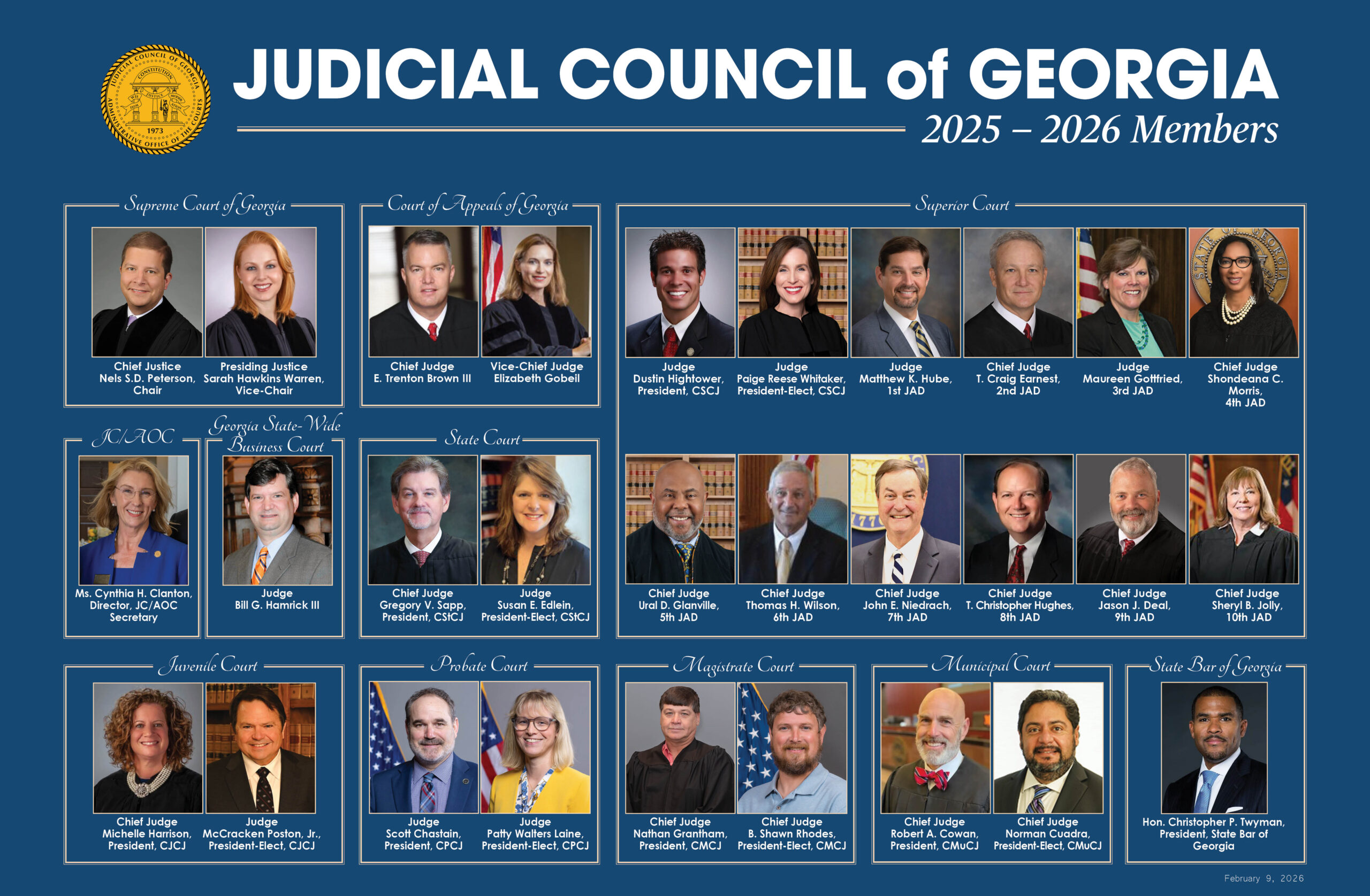 The Judicial Council of Georgia was created in 1945 to develop policies for administering and improving Georgia Courts. The Judicial Council and its committees meet throughout the year to address specific aspects of court administration and improvement. Chaired by the Chief Justice of the Supreme Court of Georgia, the Council is made up of 28 members who represent every class of court and the State Bar of Georgia.